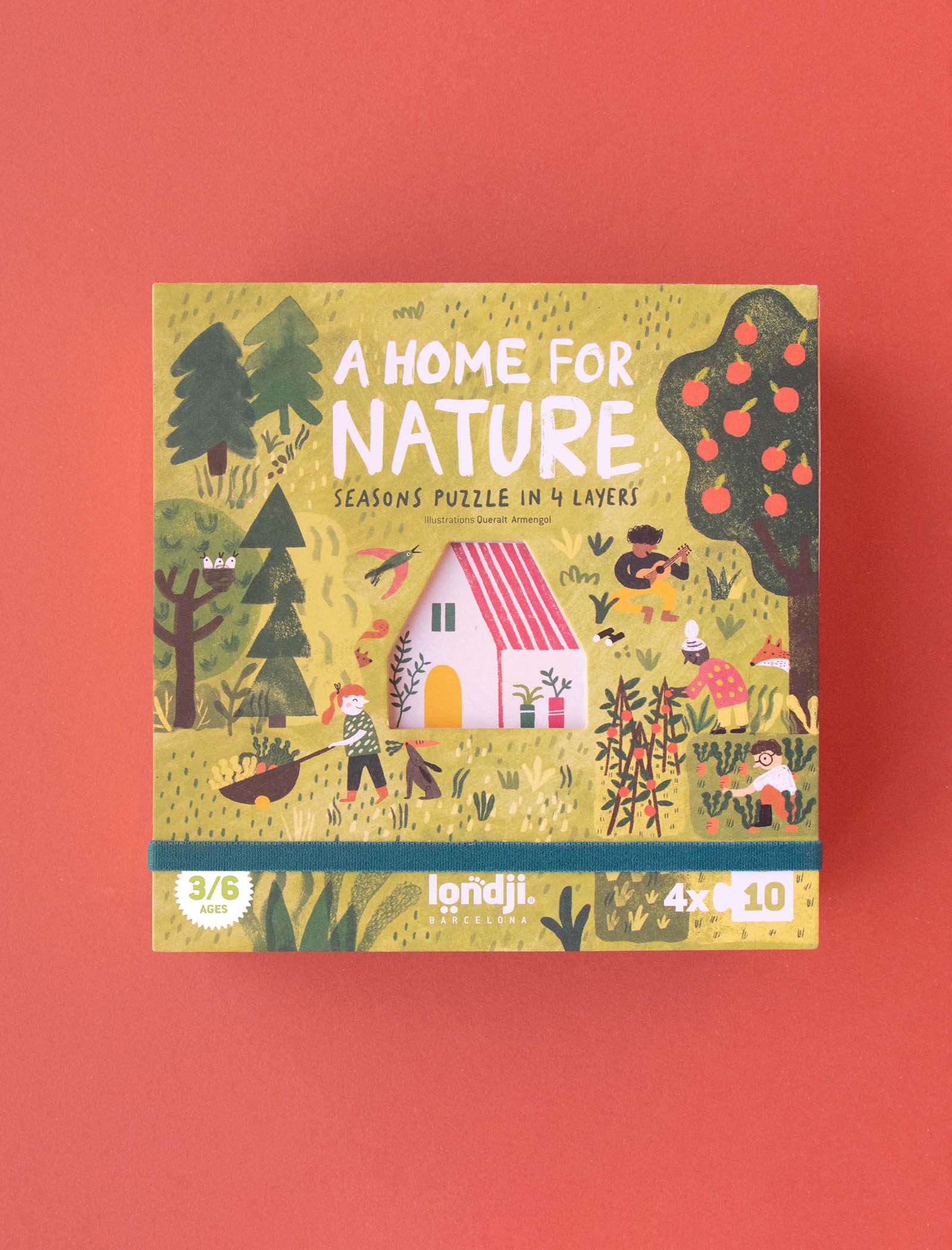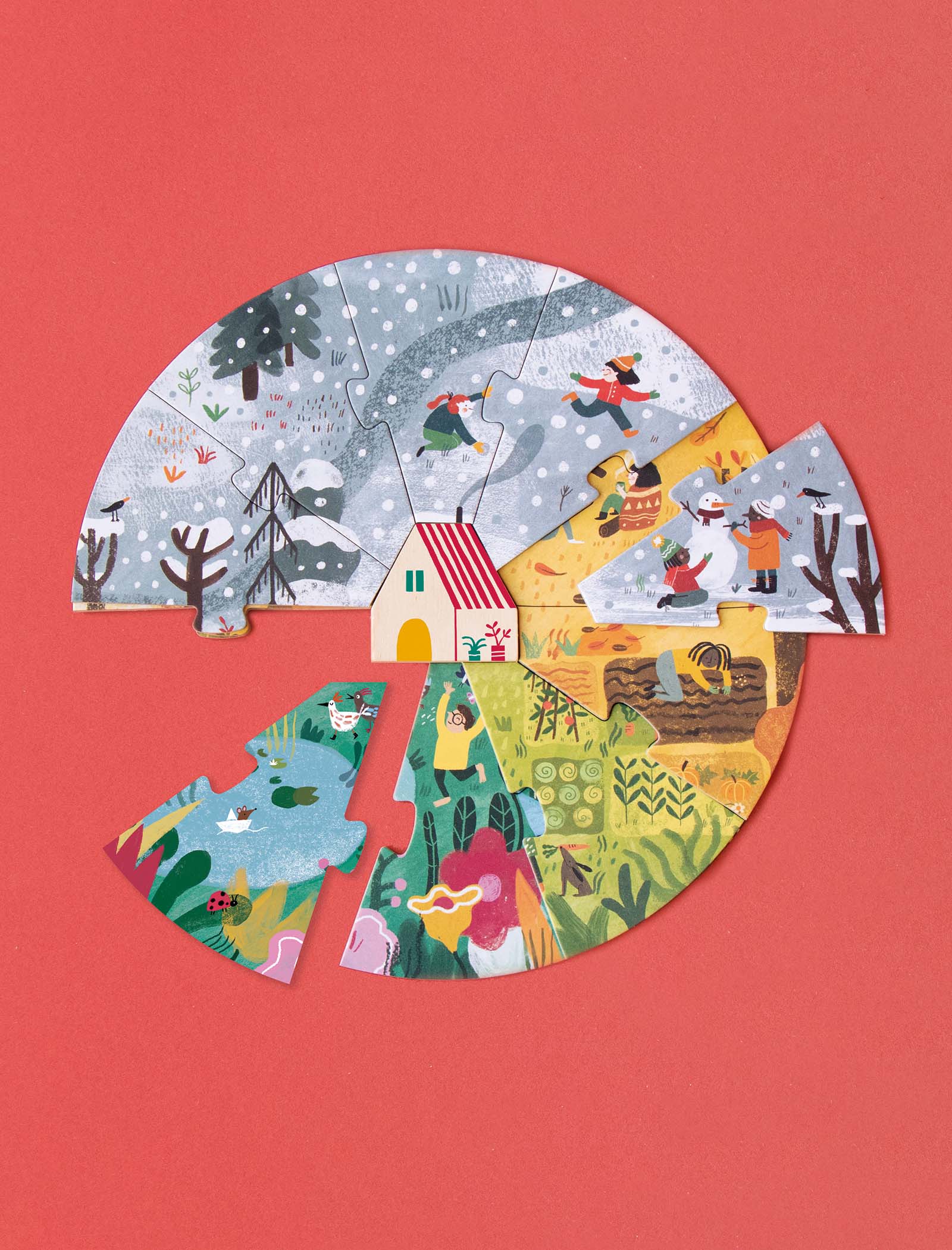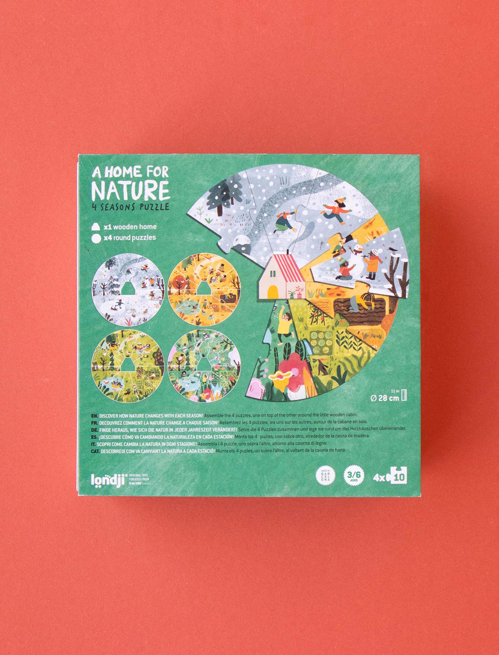 Incluye 4 puzles, de 10 piezas cada uno, que se montan uno sobre otro para ir descubriendo cómo cambia la naturaleza en cada estación, con una casa de madera.