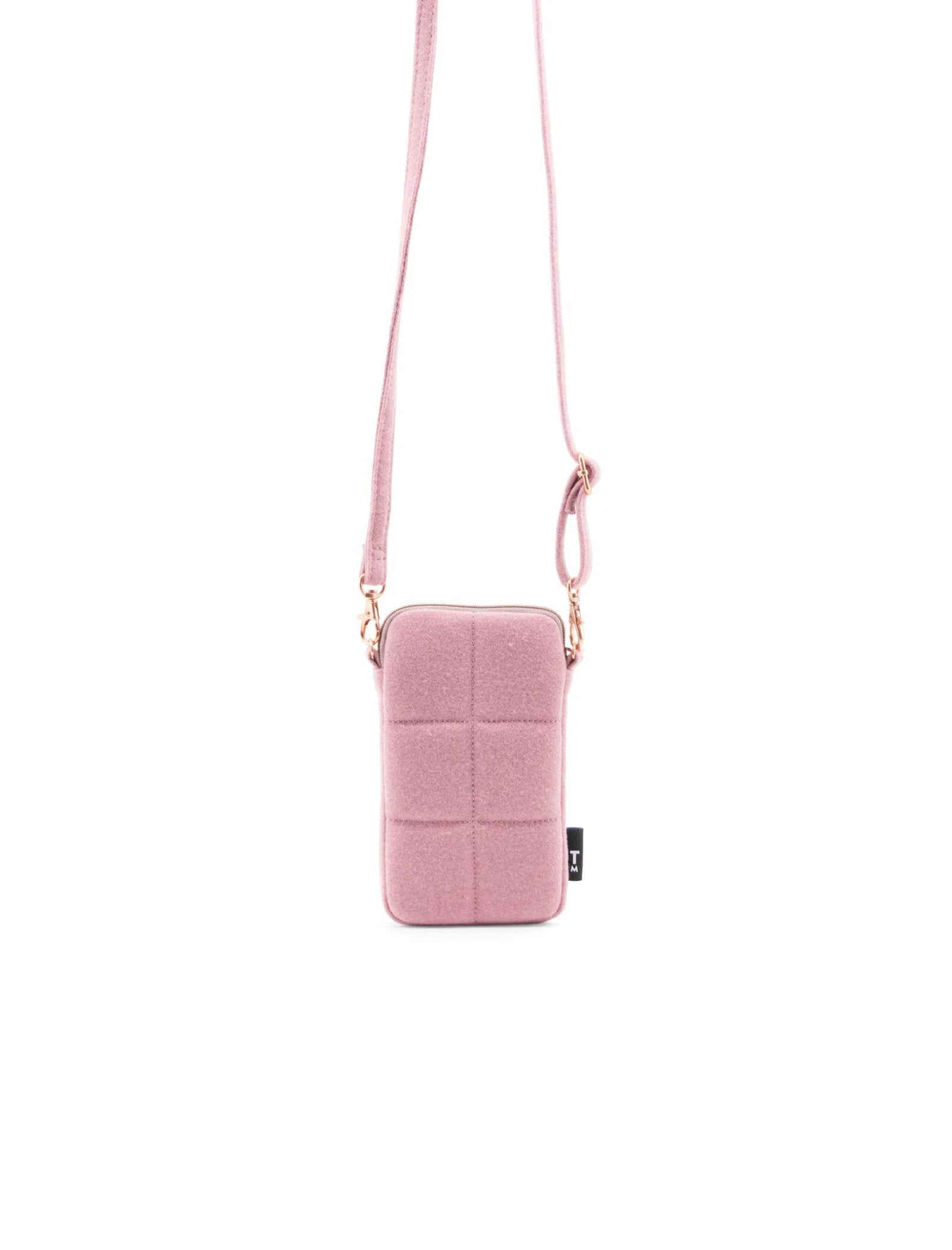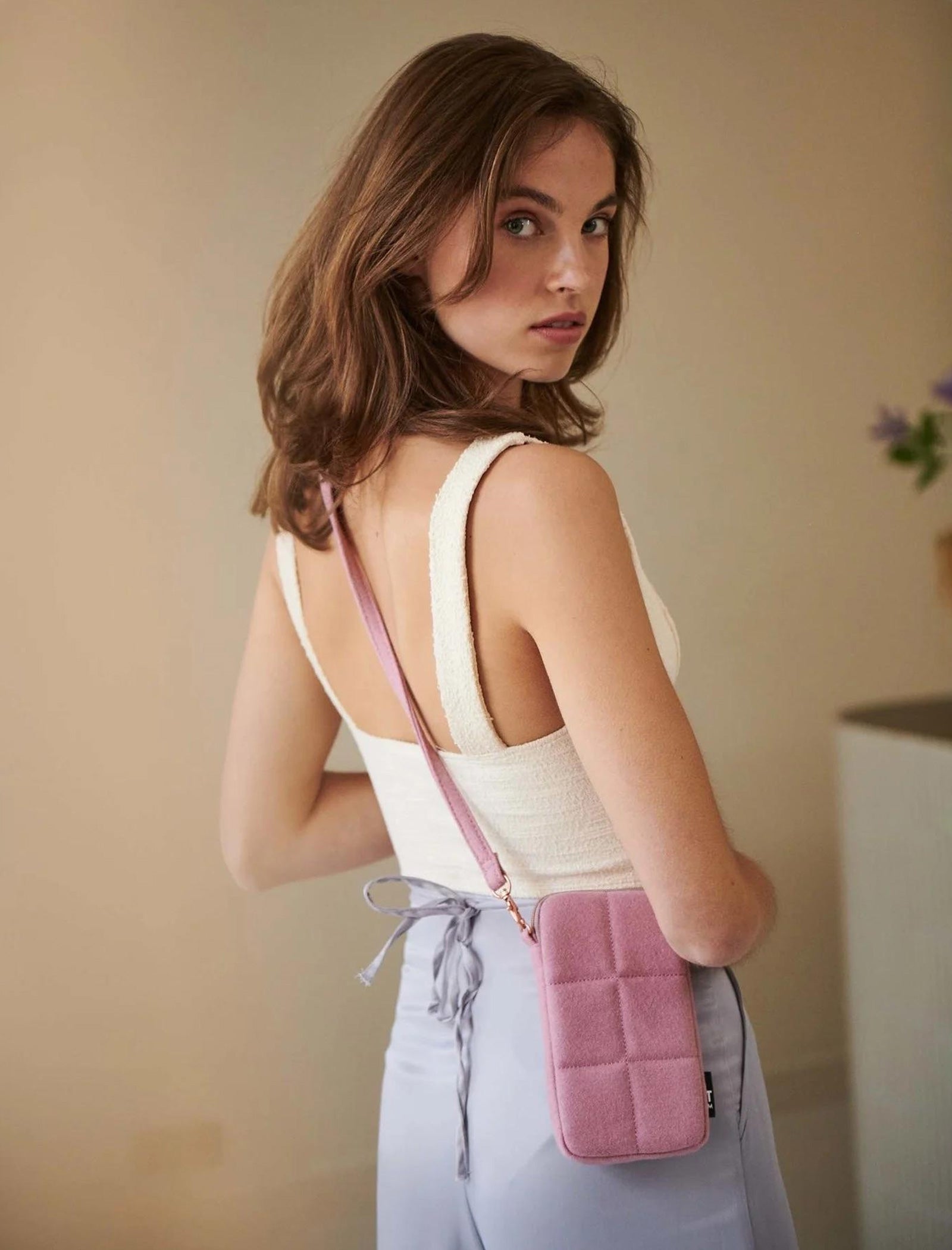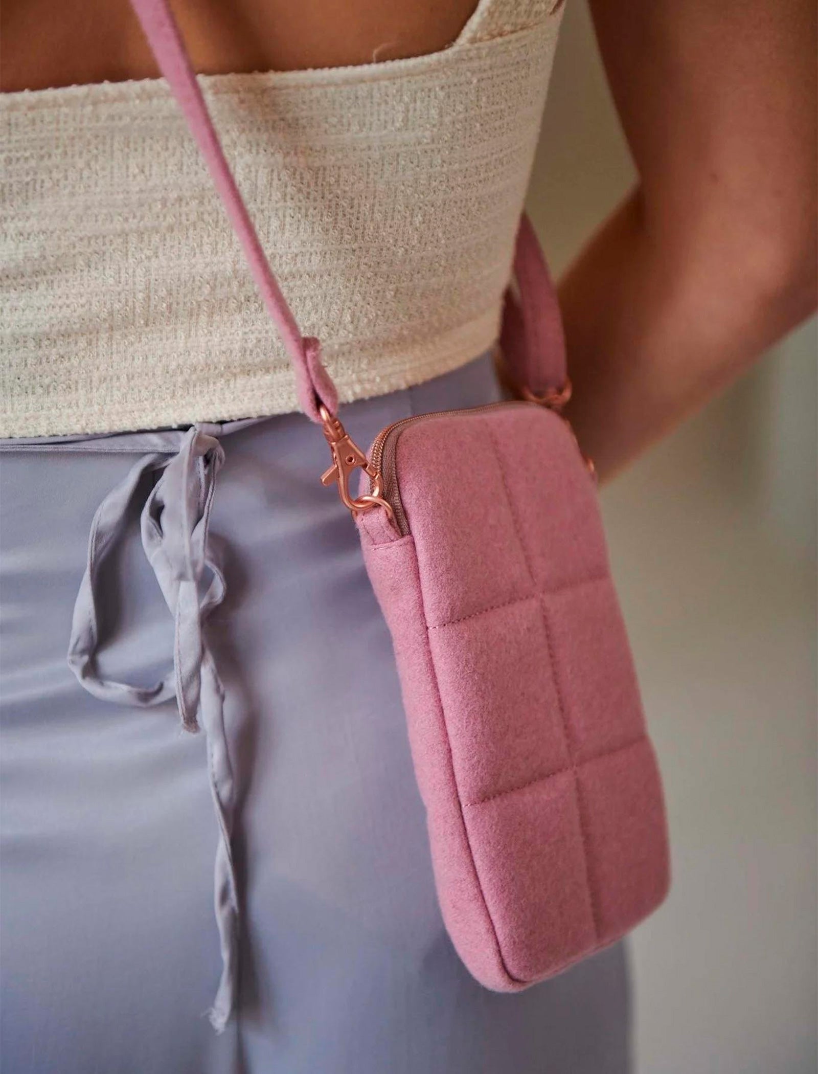 Fabricada en lana vegana para las más osadas, su interior de nailon impermeable protege tus esenciales incluso en los días más lluviosos. Con cremallera y un práctico bolsillo para tu tarjeta bancaria, esta funda de 17 cm es el hogar perfecto para tu móvil, sin importar el tamaño. ¡Porque tú marcas tendencia hasta con los detalles!"