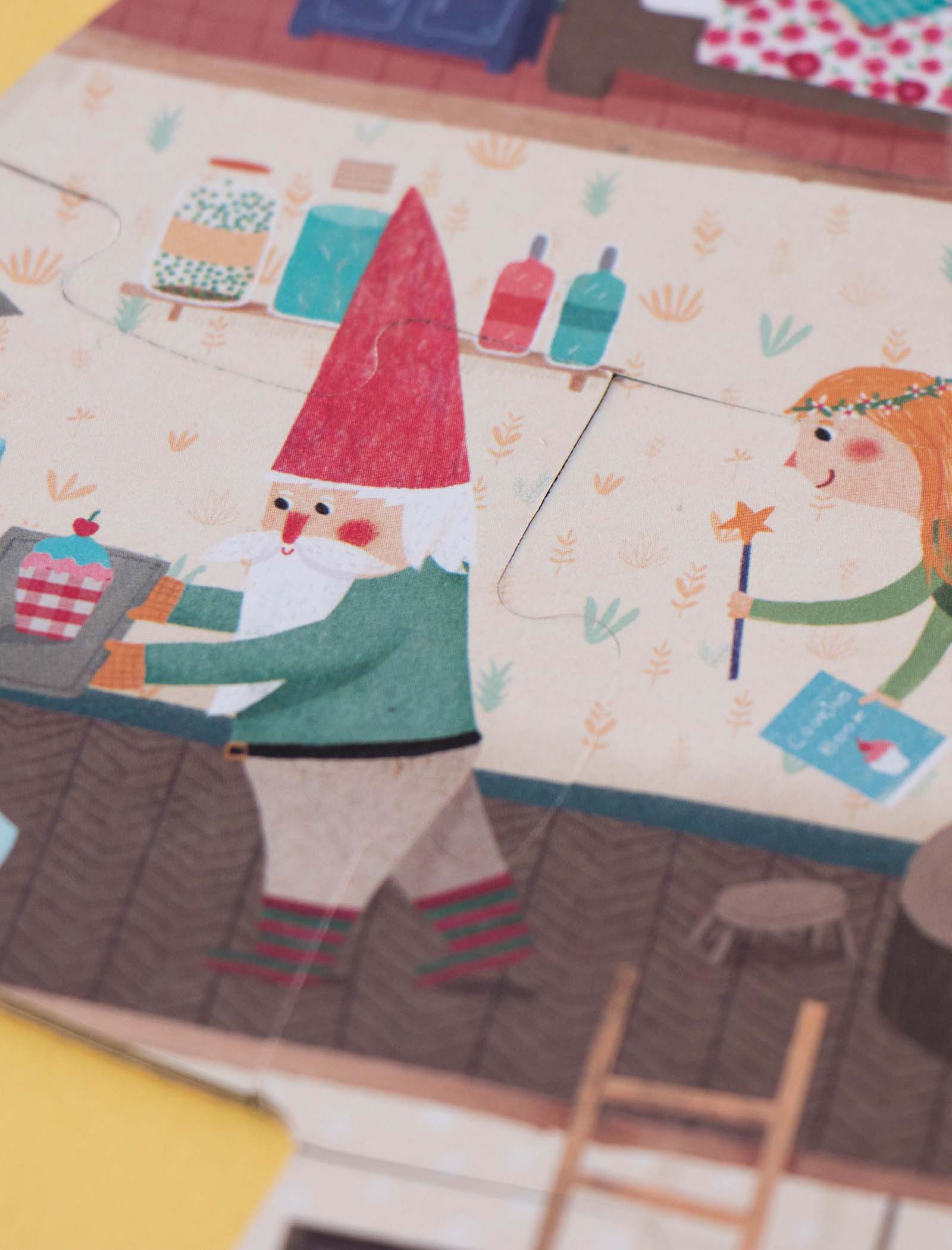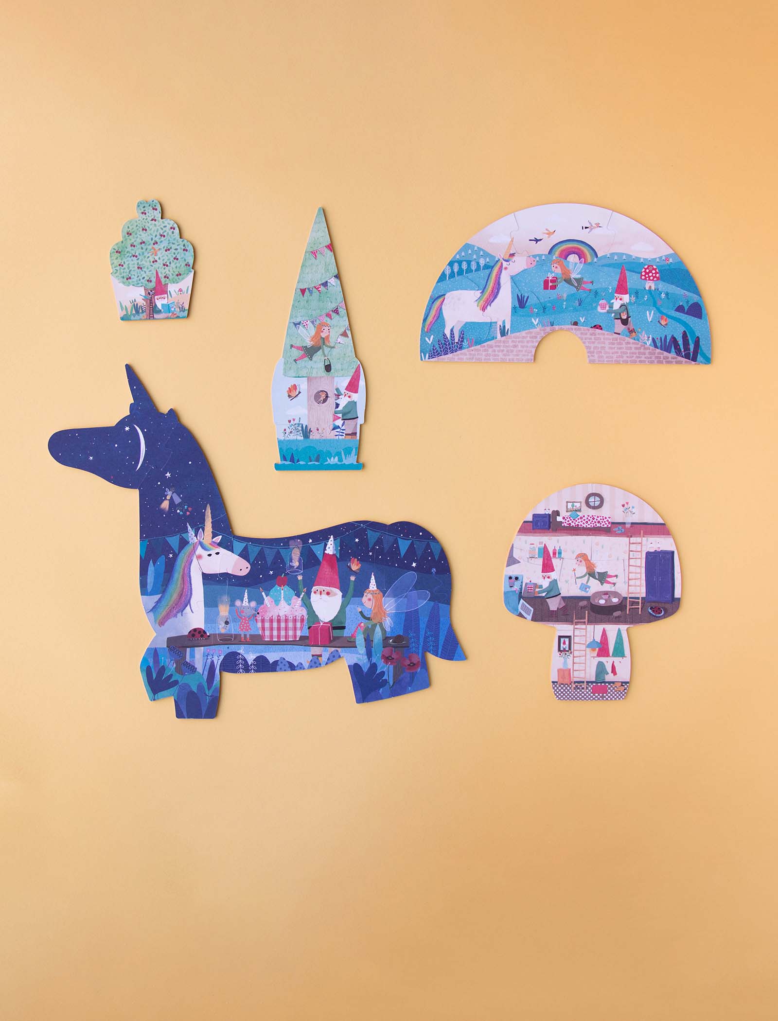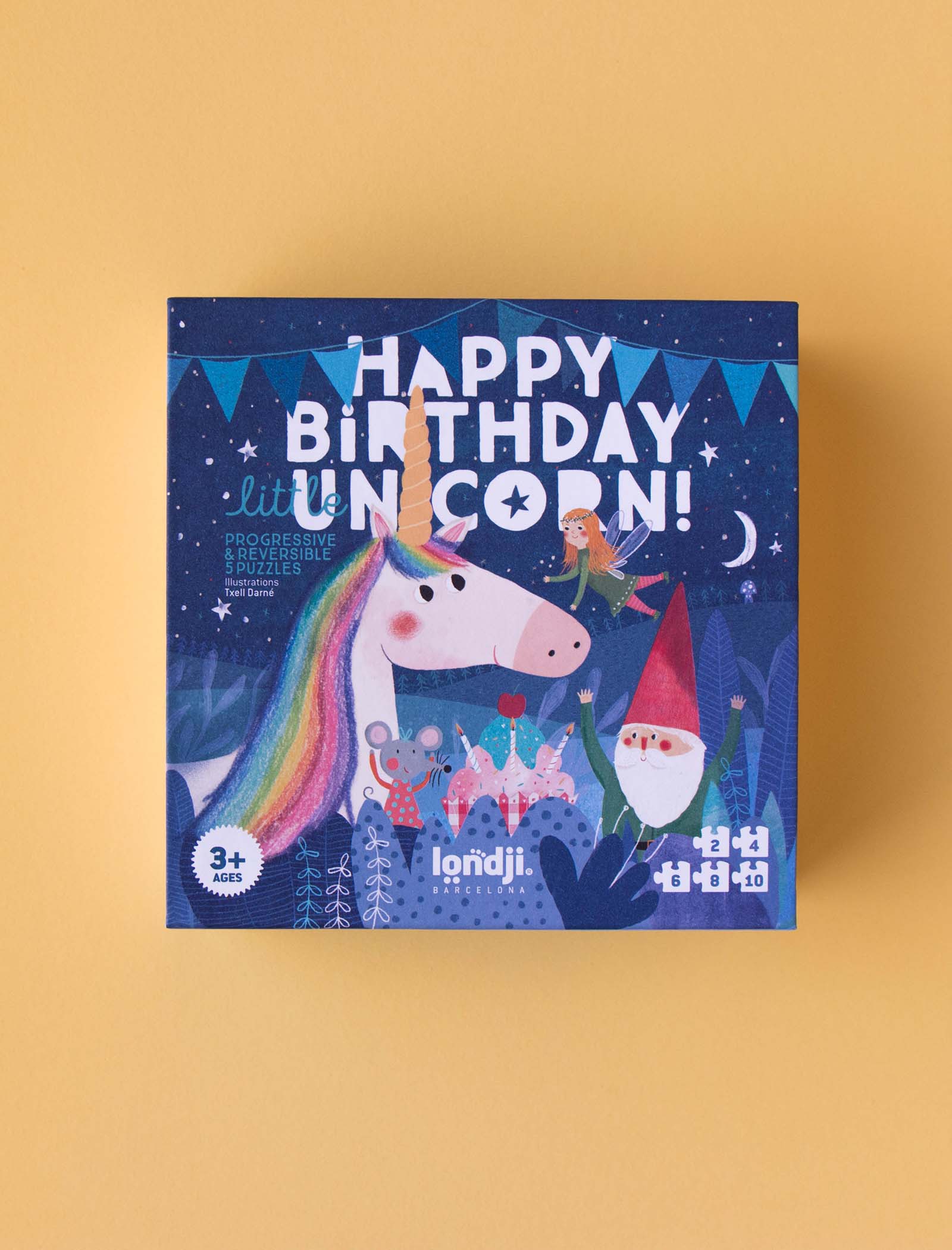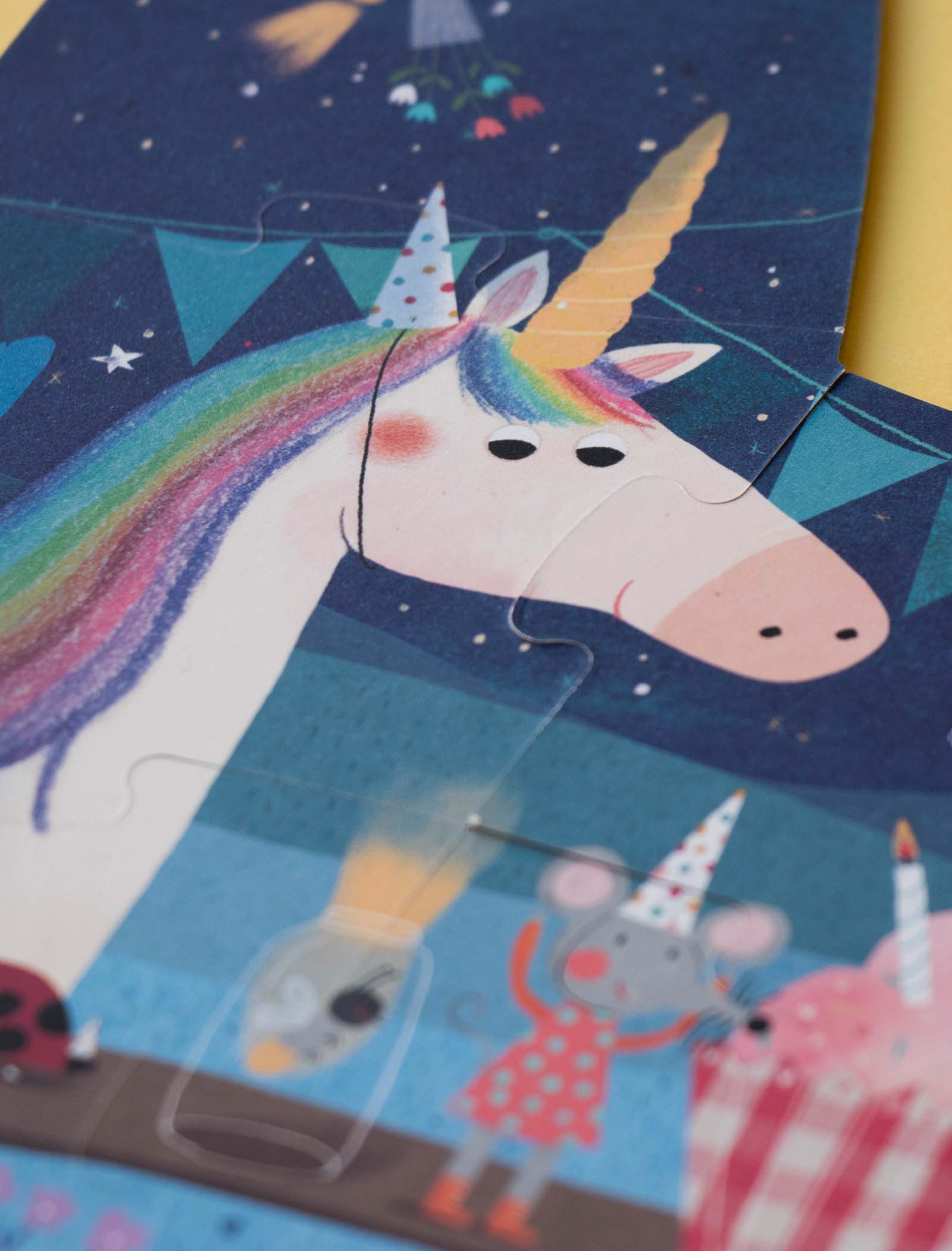 5 puzzles progresivos (de 2 a 10 piezas) y reversibles para los más pequeños en los que el unicornio es el protagonista de una hermosa historia de amistad.