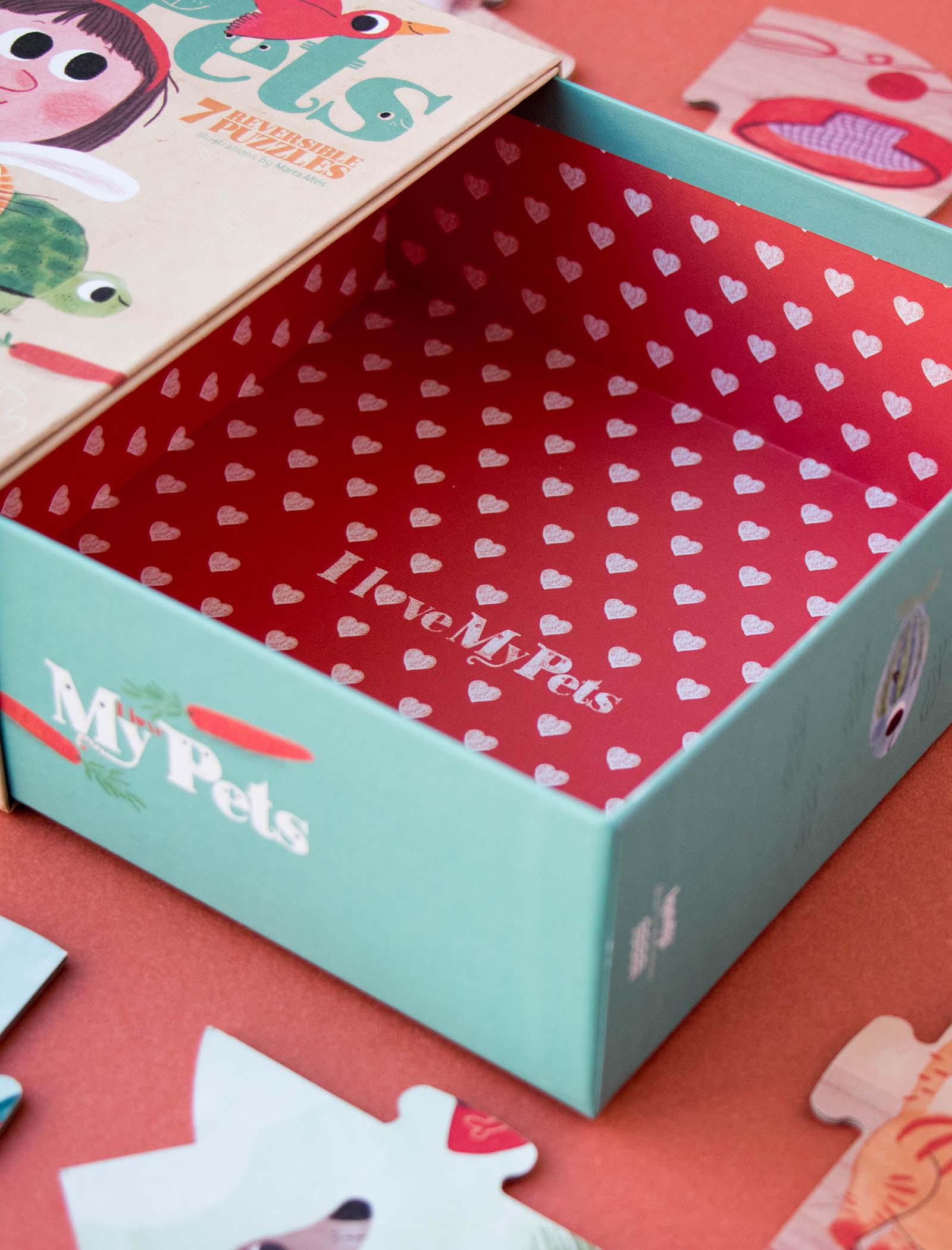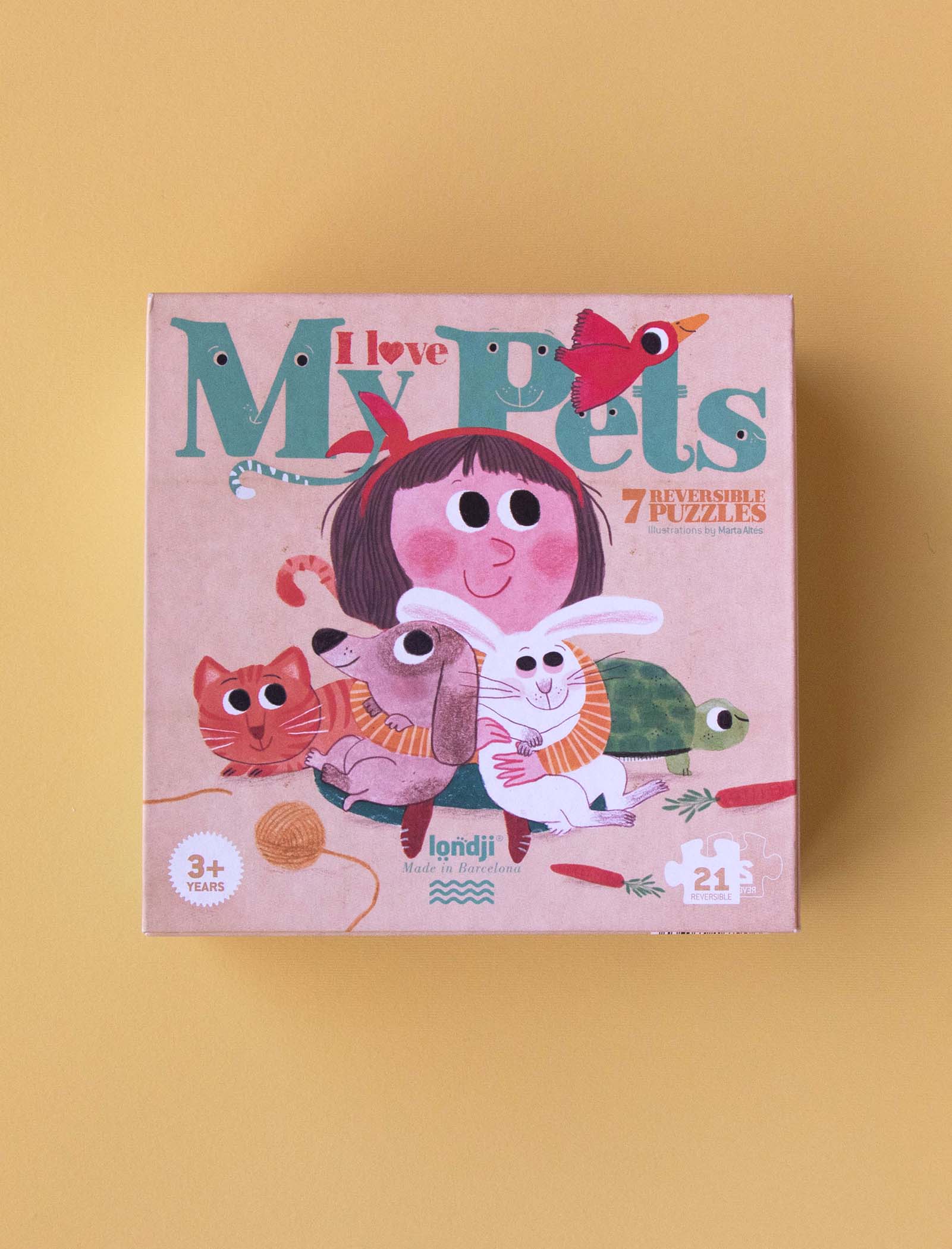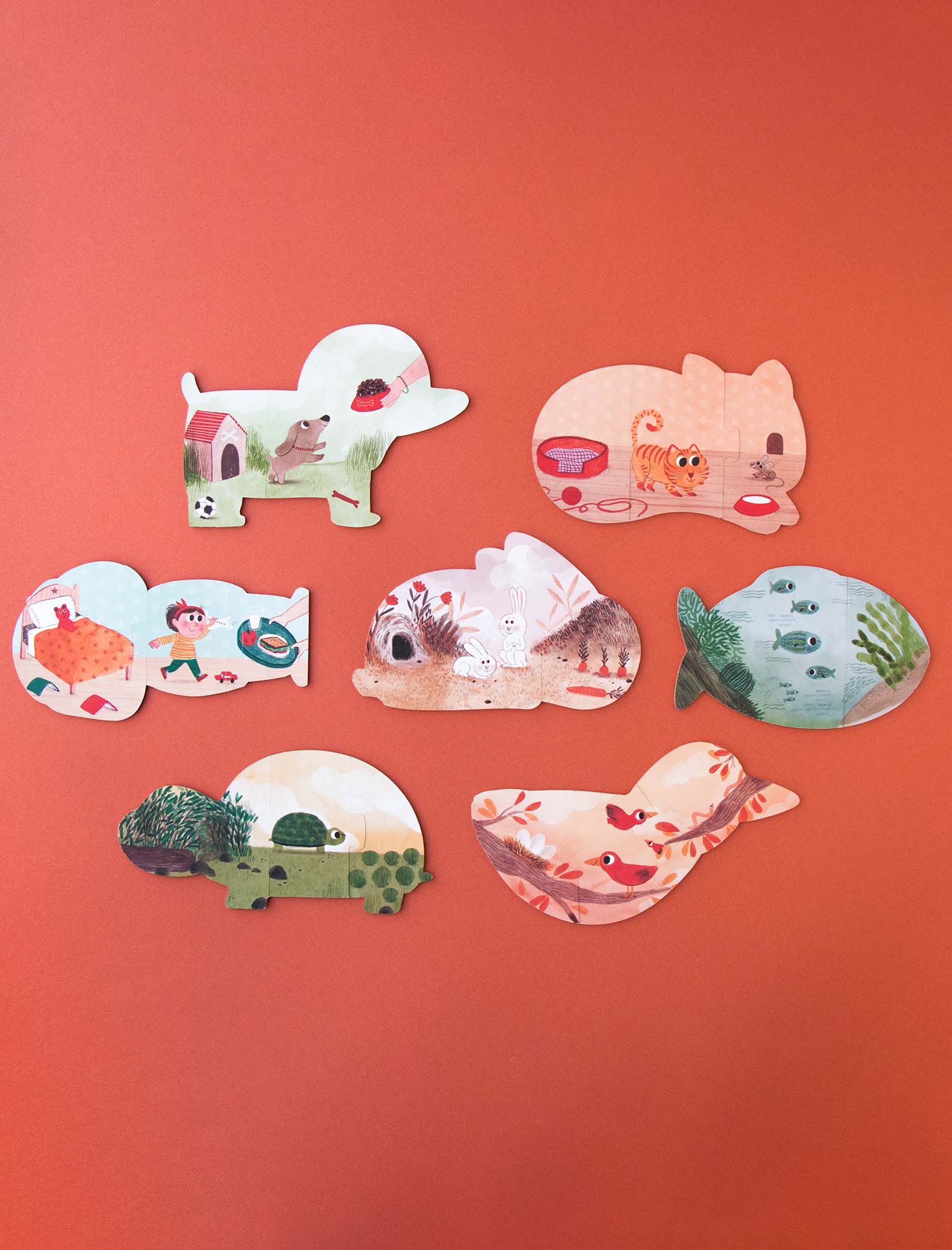 En la caja encontrarás 7 puzzles, seis son animales de compañía y el séptimo una niña. Cada puzzle es reversible. Una cara nos muestra la mascota y si lo montamos por el reverso descubriremos el habitat donde vive su protagonista.