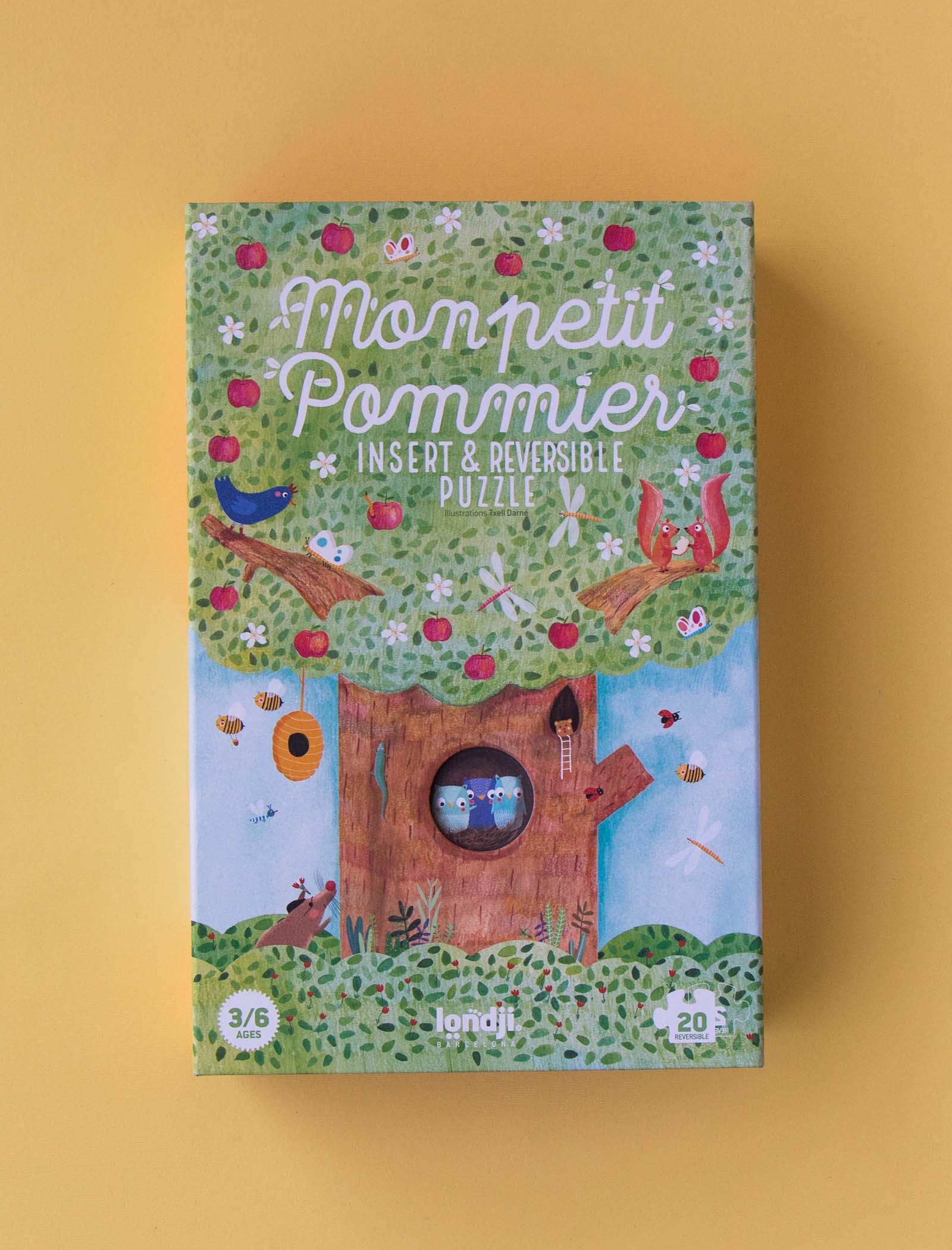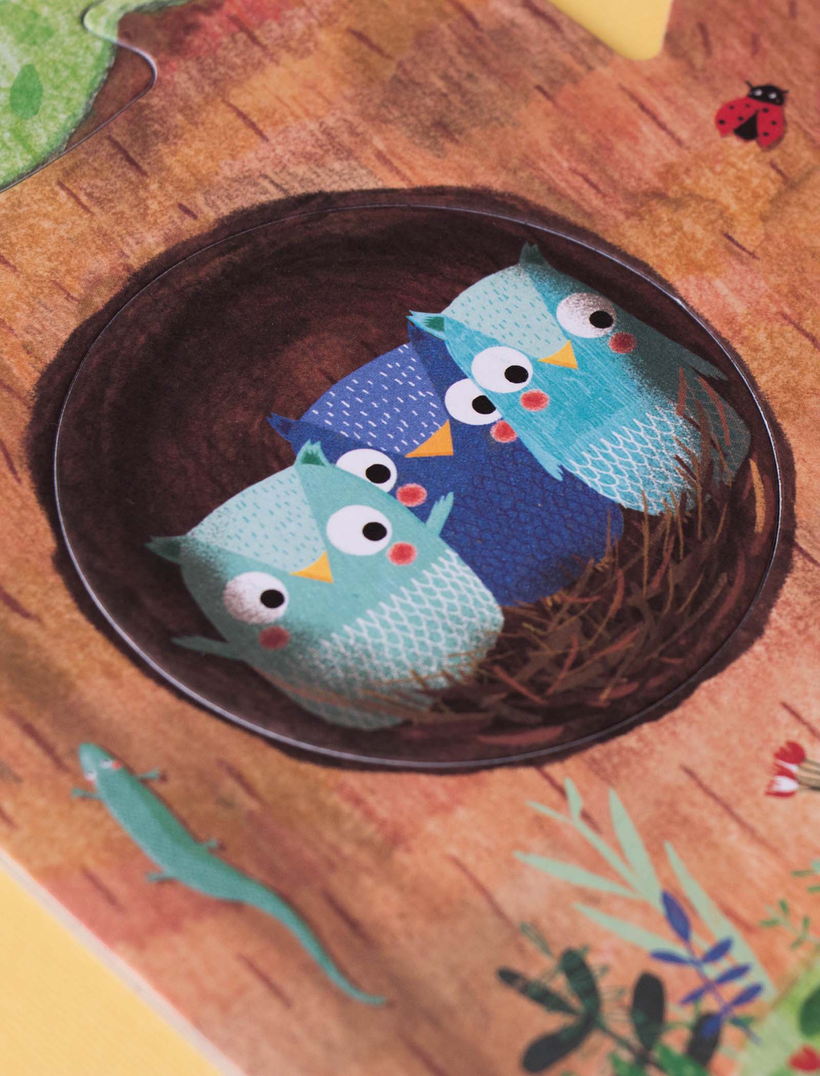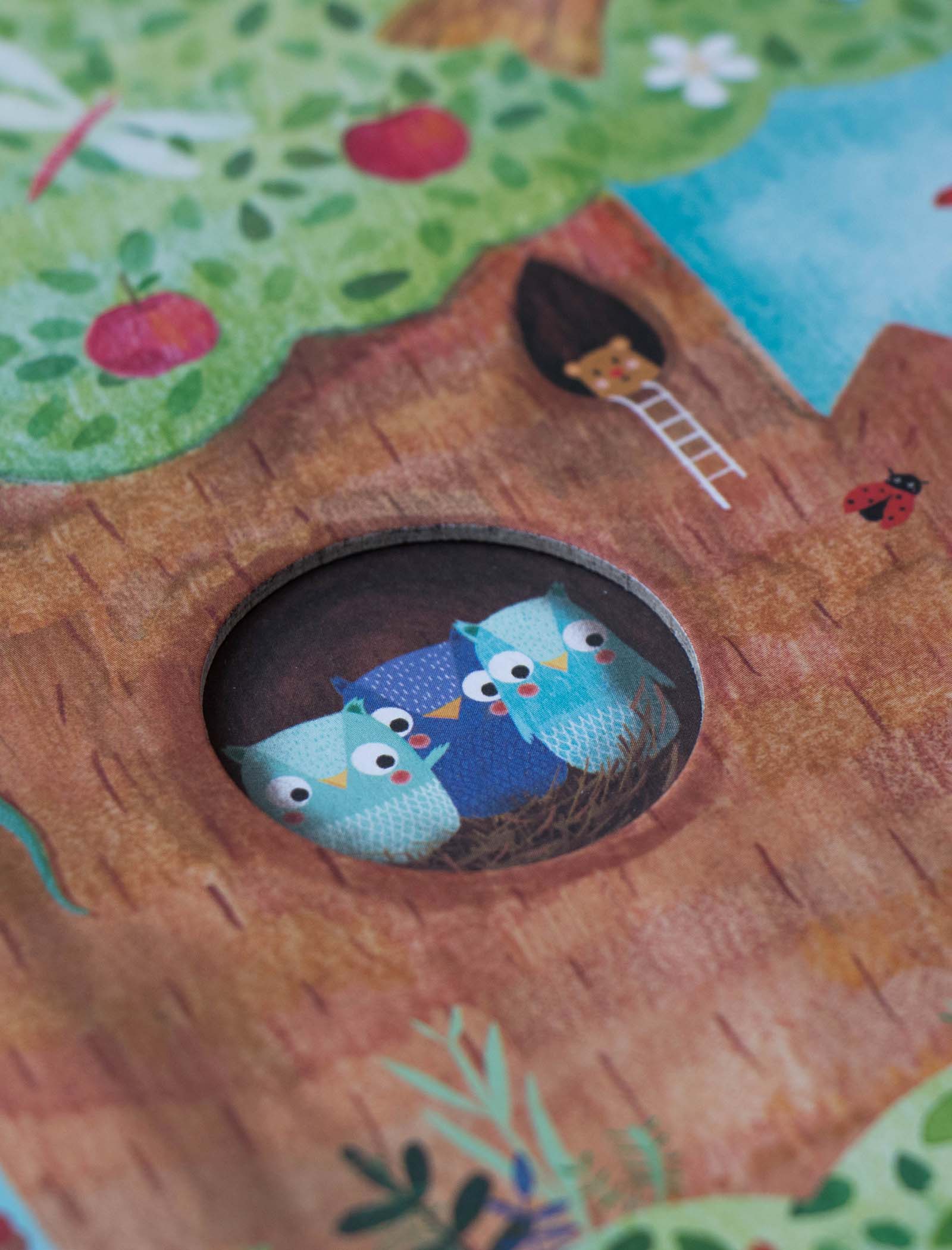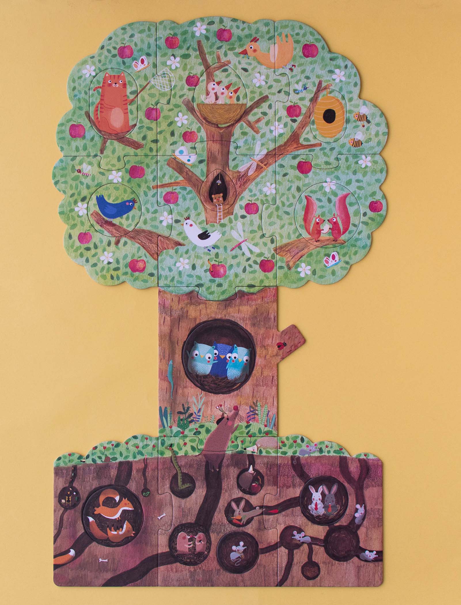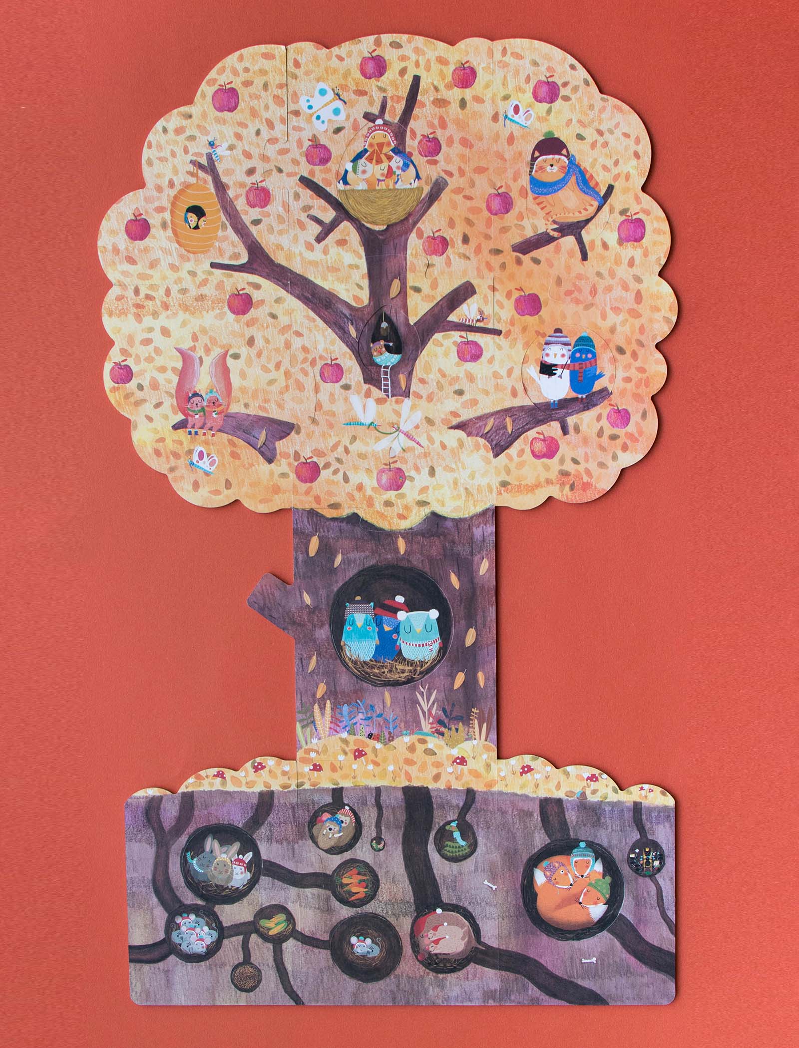 Nuestro manzano en primavera acoge a una familia de ardillas, un nido con pequeños pájaros, un gato travieso y unos búhos juguetones. Bajo tierra ratones, conejos y topos se esconden dentro de sus madrigueras. En otoño ya hemos cosechado las dulces manzanas, descubre lo que hacen nuestros amigos hasta que vuelva el buen tiempo.