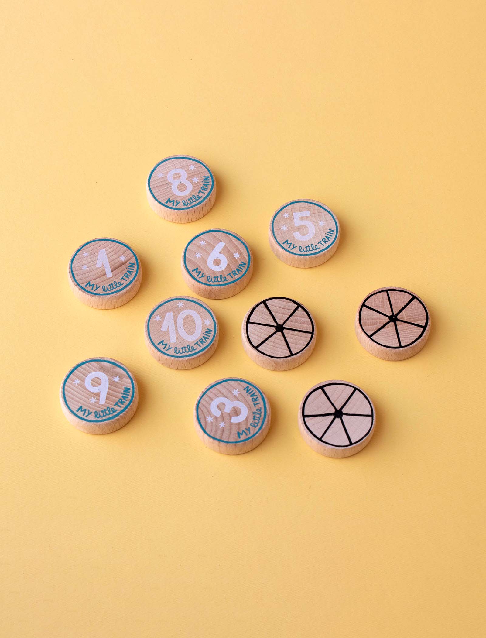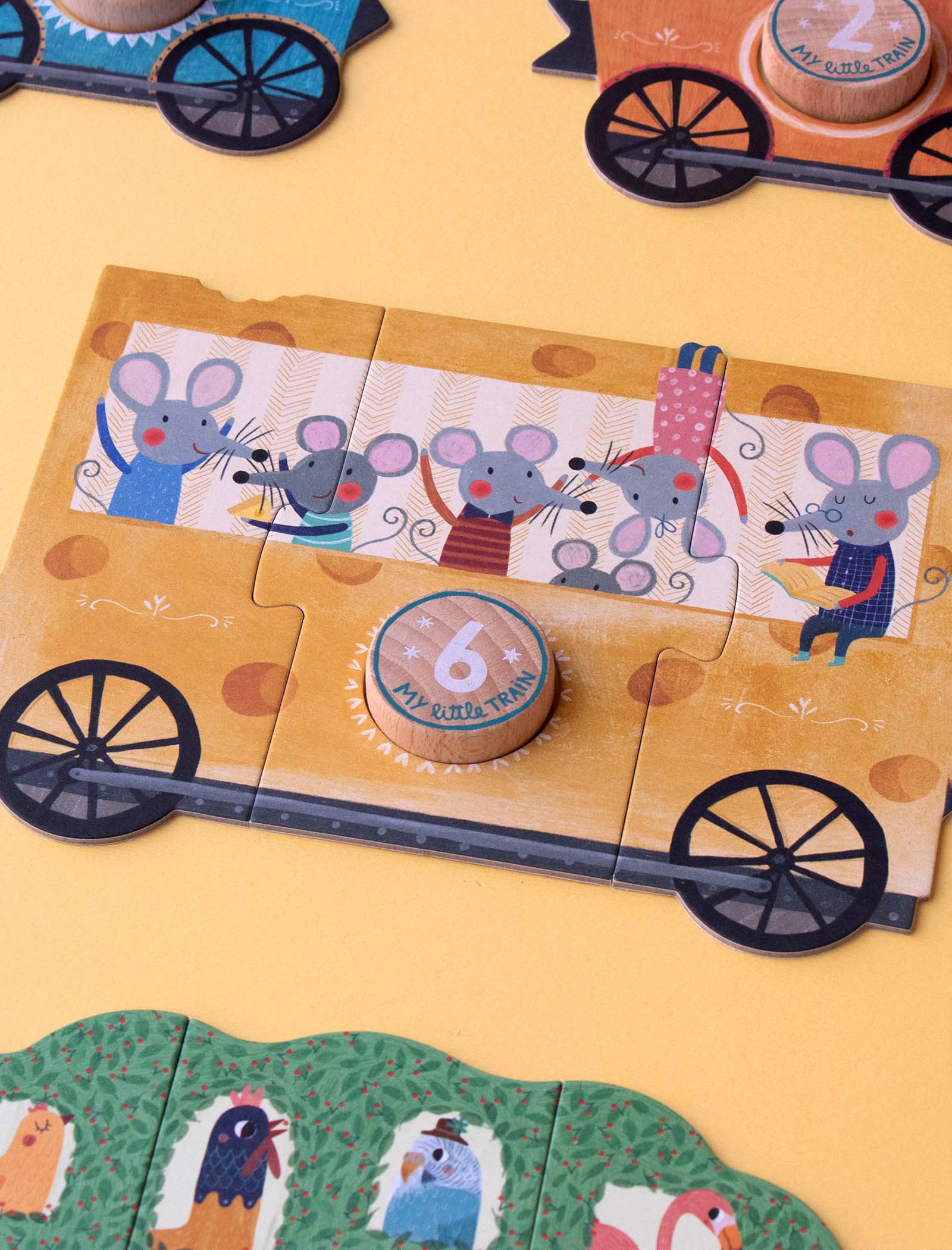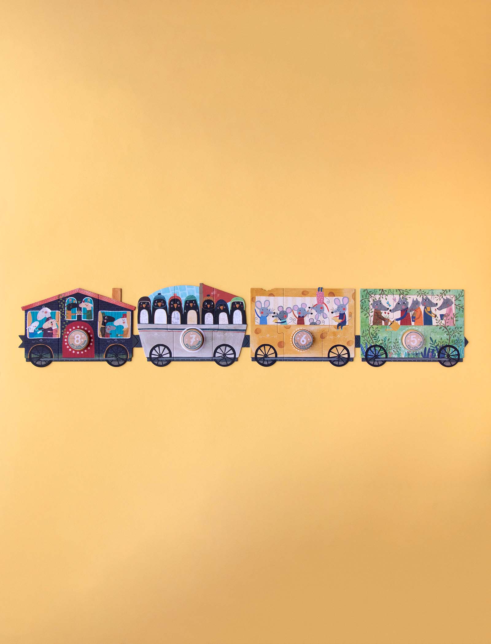 10 puzles en forma de vagones de tren de 3 piezas con una pieza de madera encajable para cada uno.