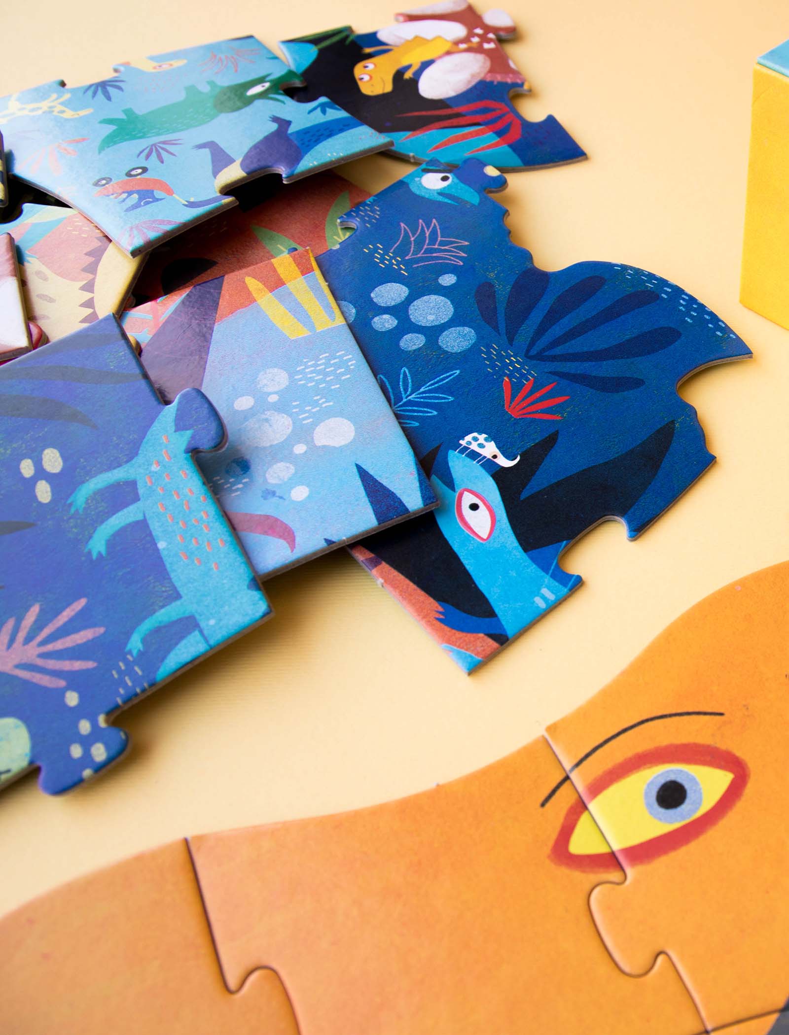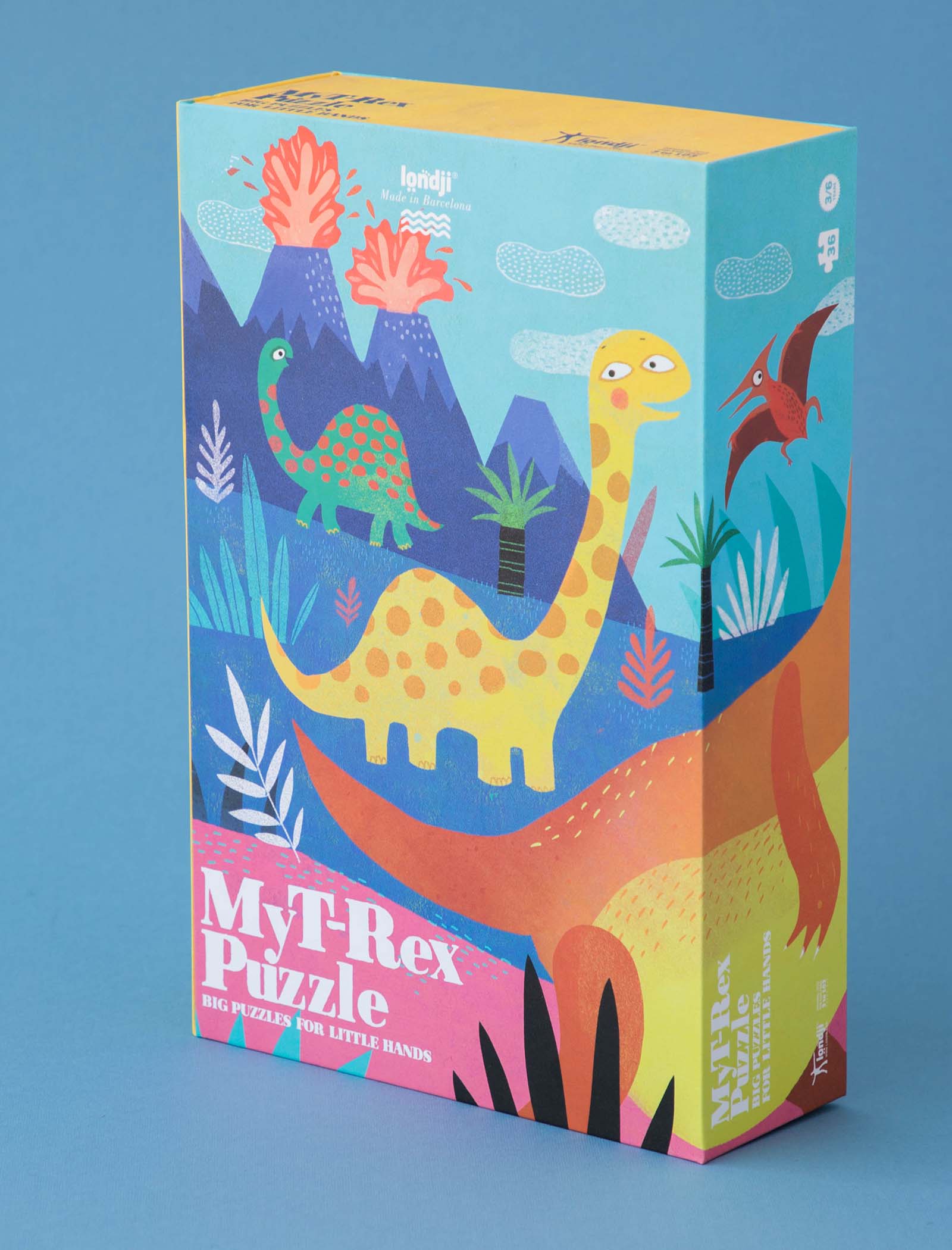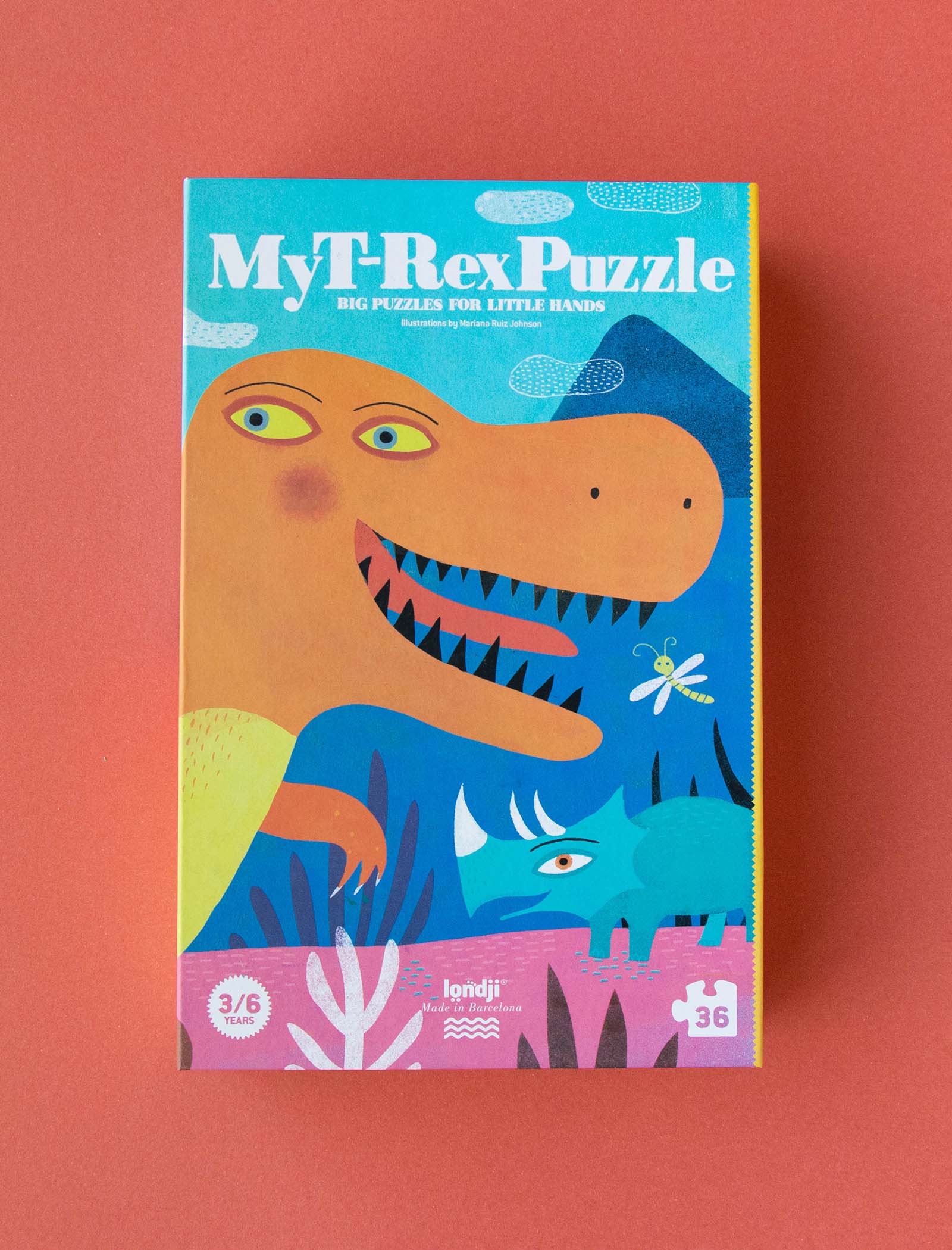 Un puzzle de formas de 36 piezas protagonizado por un T Rex con el que exploraremos la época de los dinosaurios. Para niñas y niños de 3 a 6 años.