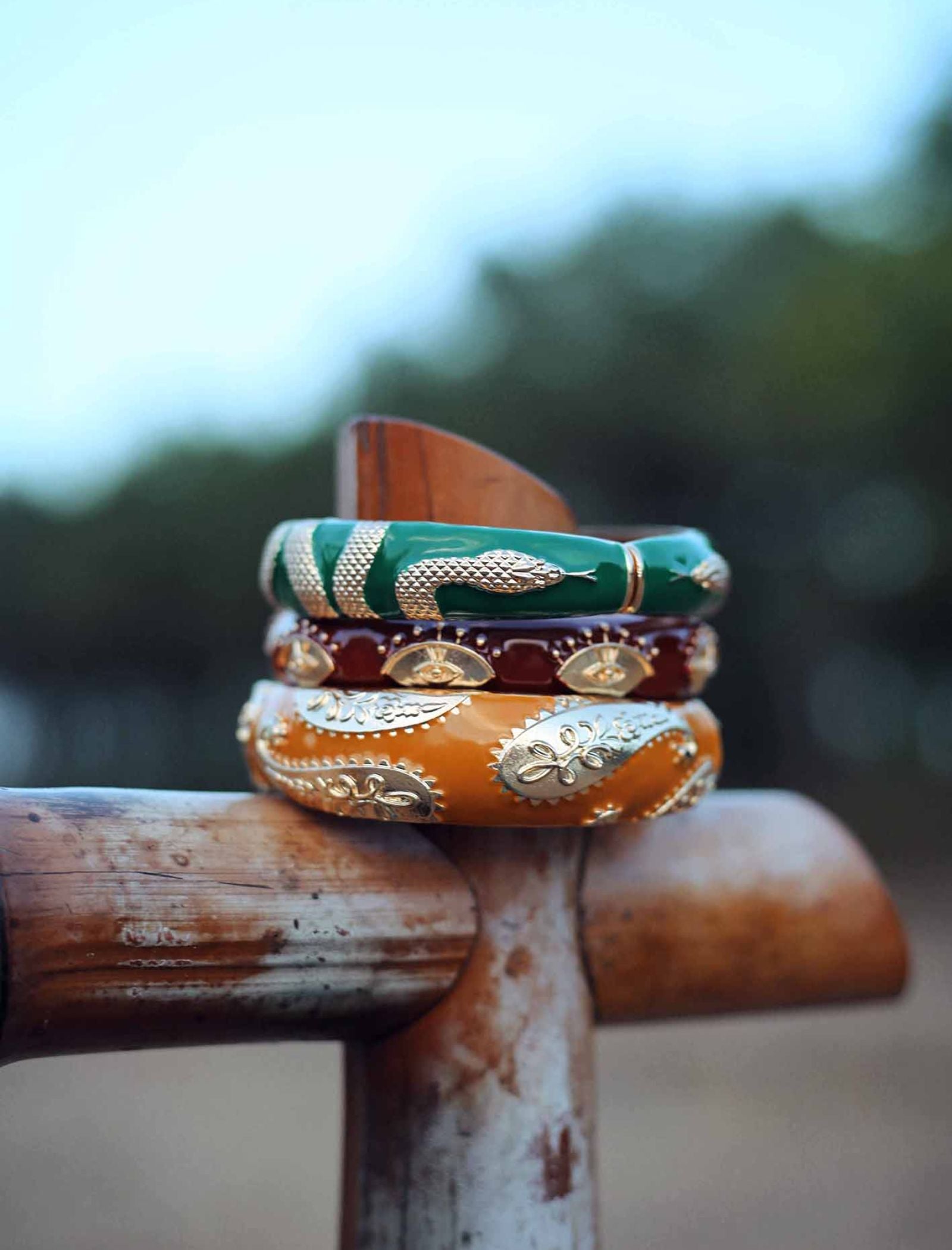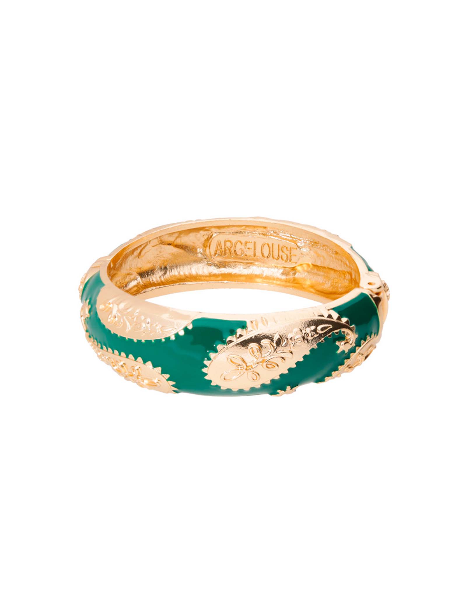 Esta pulsera estilo boho con estampado étnico es una joya que destaca por su exquisita artesanía. Hecha a mano, cuenta con un lujoso baño de oro y detalles en esmalte esmeralda vibrante aplicados en frío, ofreciendo un diseño elegante y versátil. Perfecta para elevar cualquier outfit, es el complemento bohemio imprescindible para mujeres que buscan accesorios únicos y de alta calidad.