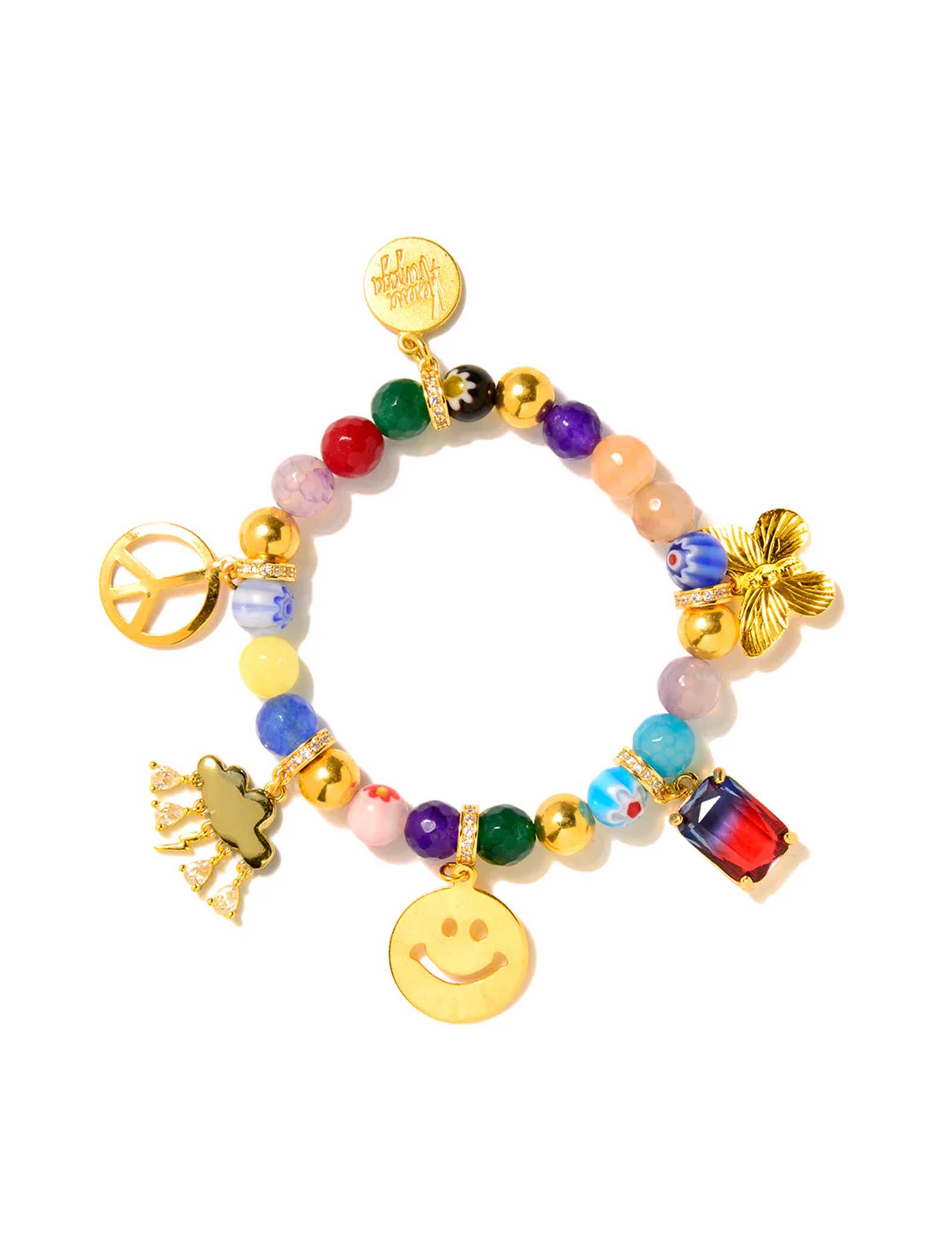 Lleva tu estilo a otro nivel con la pulsera "COLOR ME HAPPY", una explosión de energía y color que no solo complementa tu outfit, sino que lo transforma por completo. Hecha a mano con jade teñido en deslumbrantes tonos y adornada con dijes de millefiori, esta joya combina a la perfección la elegancia de los cristales de imitación brillantes y el encanto juguetón de los charms colgantes.