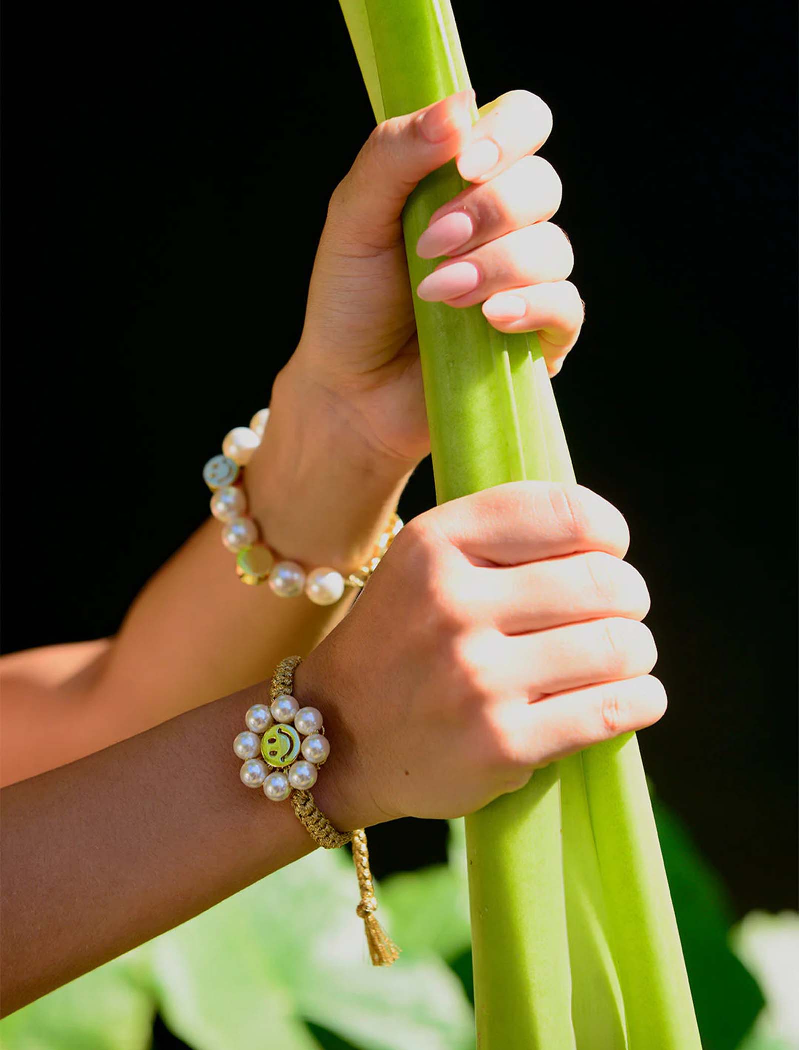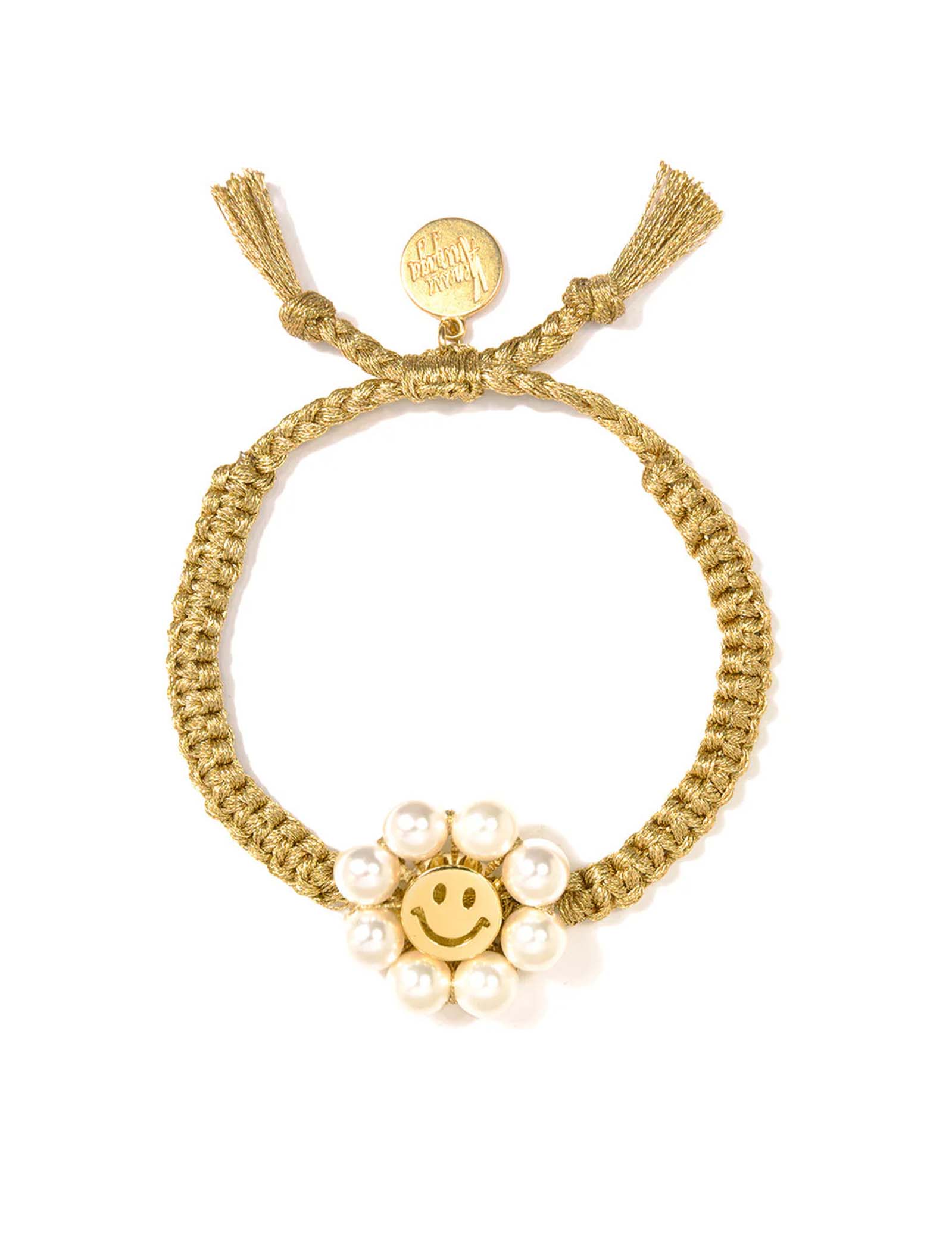 Descubre la pulsera Golden Daisy, una joya sofisticada que combina la delicadeza de las perlas con un toque de modernidad y diversión. Este brazalete exclusivo cuenta con un hilo dorado que resplandece y realza la elegancia de cada detalle. Las perlas en forma de margarita añaden un encanto atemporal, mientras que el charm central de carita Smiley, elaborado en latón bañado en oro, es un guiño chic que evoca positividad y optimismo.