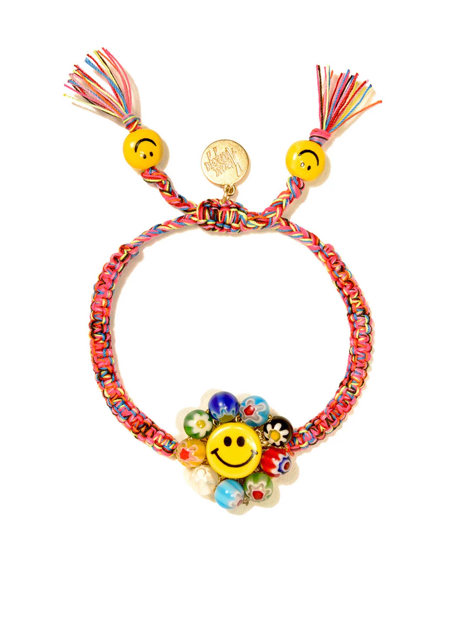Este brazalete exclusivo y alegre está diseñado para mujeres fuertes, empoderadas y seguras de sí mismas. Teje una historia de felicidad con su cordón multicolor ajustable y detalles que llaman la atención. Los dijes de cerámica incluyen un sonriente y encantador centro, rodeado por charms de vidrio Millefiori, cada uno hecho a mano, aportando una explosión de colores únicos y vibrantes. Sus herrajes de latón chapado añaden un toque de elegancia. Creado artesanalmente en Nueva York y Puerto Rico, cada pieza es única y puede tener ligeras variaciones en los dijes, lo que hace que cada brazalete sea un verdadero testimonio de individualidad. Perfecto para quienes buscan una joya especial y llena de personalidad.