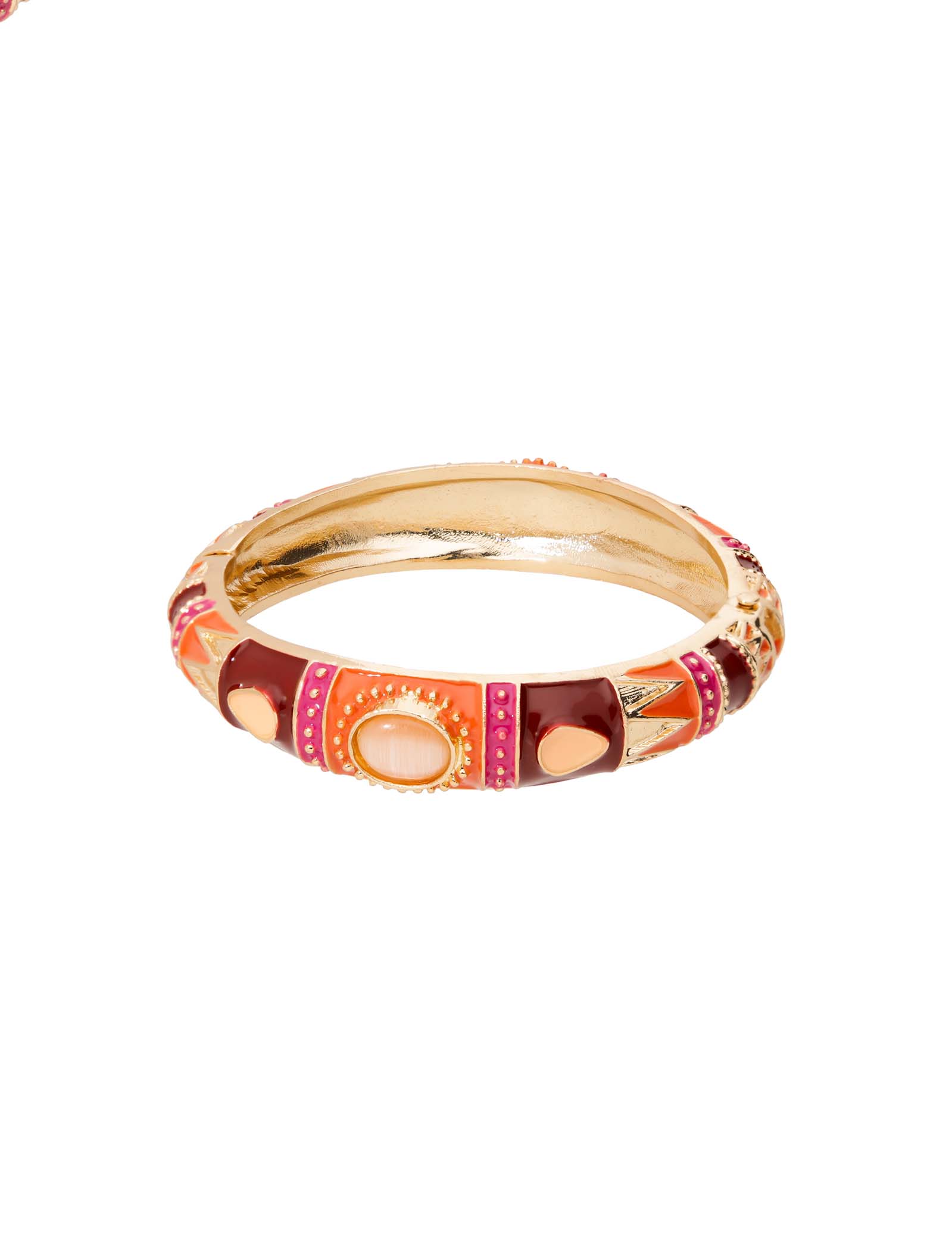 Esta pulsera estilo boho con estampado étnico es una joya que destaca por su exquisita artesanía. Hecha a mano, cuenta con un lujoso baño de oro y detalles en esmalte burdeos vibrante aplicados en frío, ofreciendo un diseño elegante y versátil. Perfecta para elevar cualquier outfit, es el complemento bohemio imprescindible para mujeres que buscan accesorios únicos y de alta calidad.