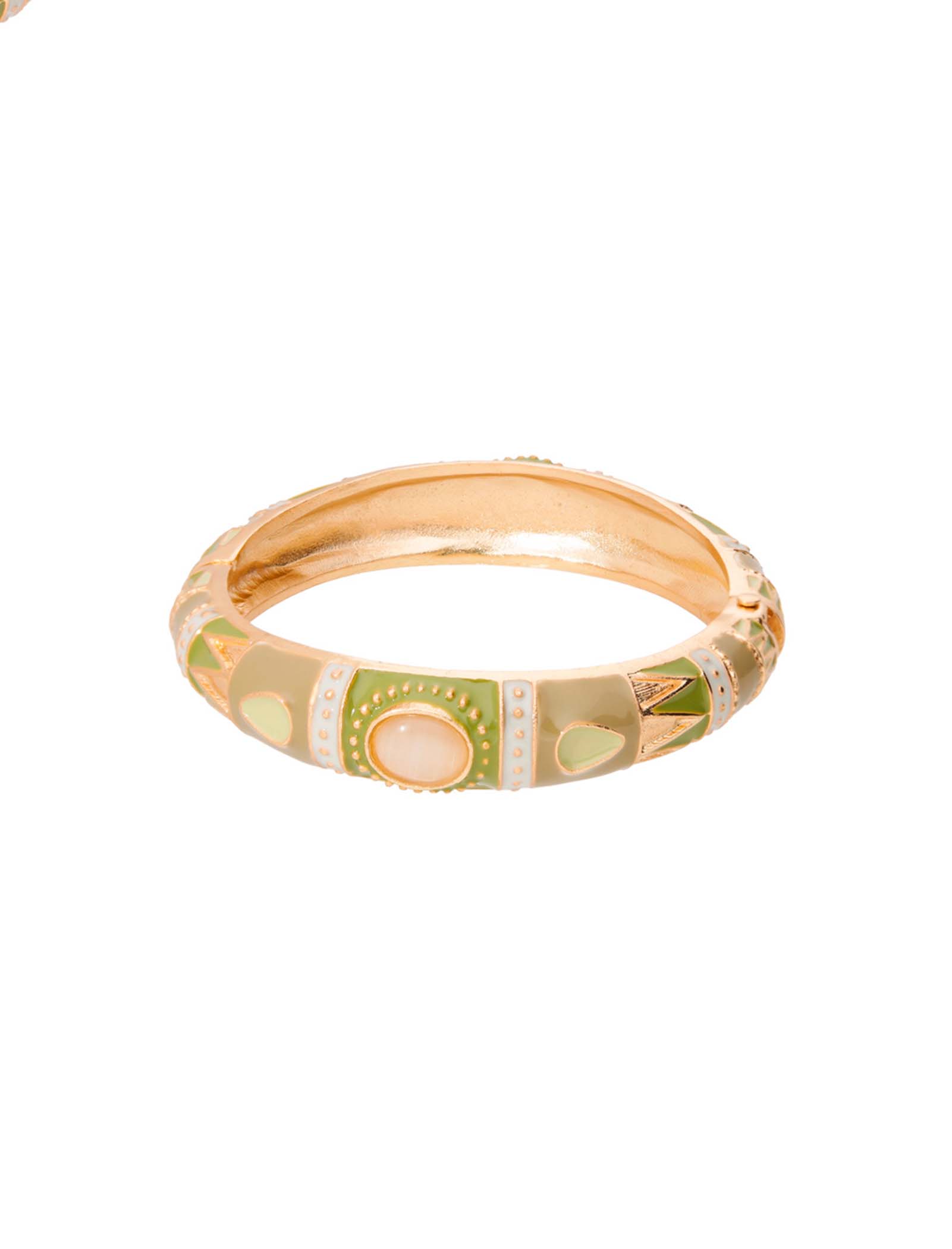 Esta pulsera estilo boho con estampado étnico es una joya que destaca por su exquisita artesanía. Hecha a mano, cuenta con un lujoso baño de oro y detalles en esmalte tilo vibrante aplicados en frío, ofreciendo un diseño elegante y versátil. Perfecta para elevar cualquier outfit, es el complemento bohemio imprescindible para mujeres que buscan accesorios únicos y de alta calidad.