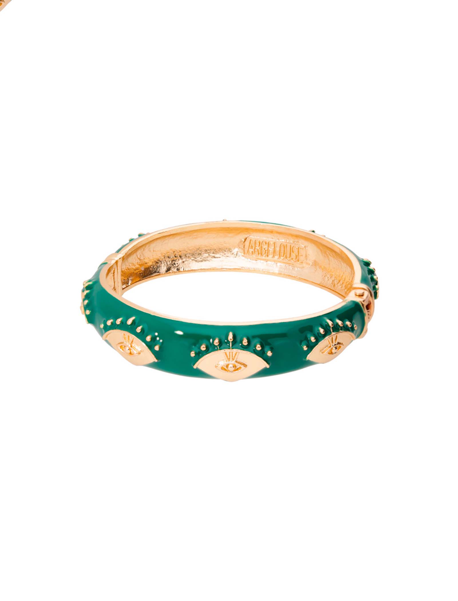 Esta pulsera estilo boho con estampado étnico es una joya que destaca por su exquisita artesanía. Hecha a mano, cuenta con un lujoso baño de oro y detalles en esmalte esmeralda vibrante aplicados en frío, ofreciendo un diseño elegante y versátil. Perfecta para elevar cualquier outfit, es el complemento bohemio imprescindible para mujeres que buscan accesorios únicos y de alta calidad.